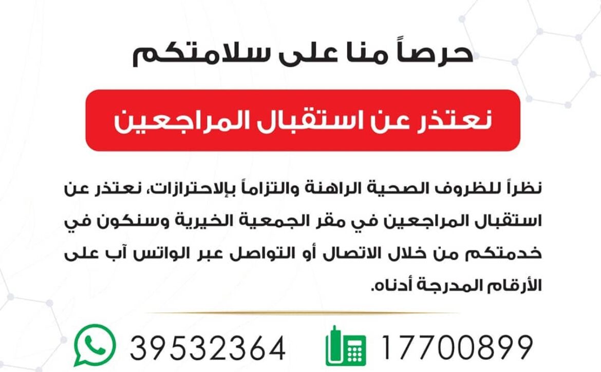 نظراً للظروف الصحية الراهنة والتزاماً بإلاحترازات، نعتذر عن استقبال المراجعين