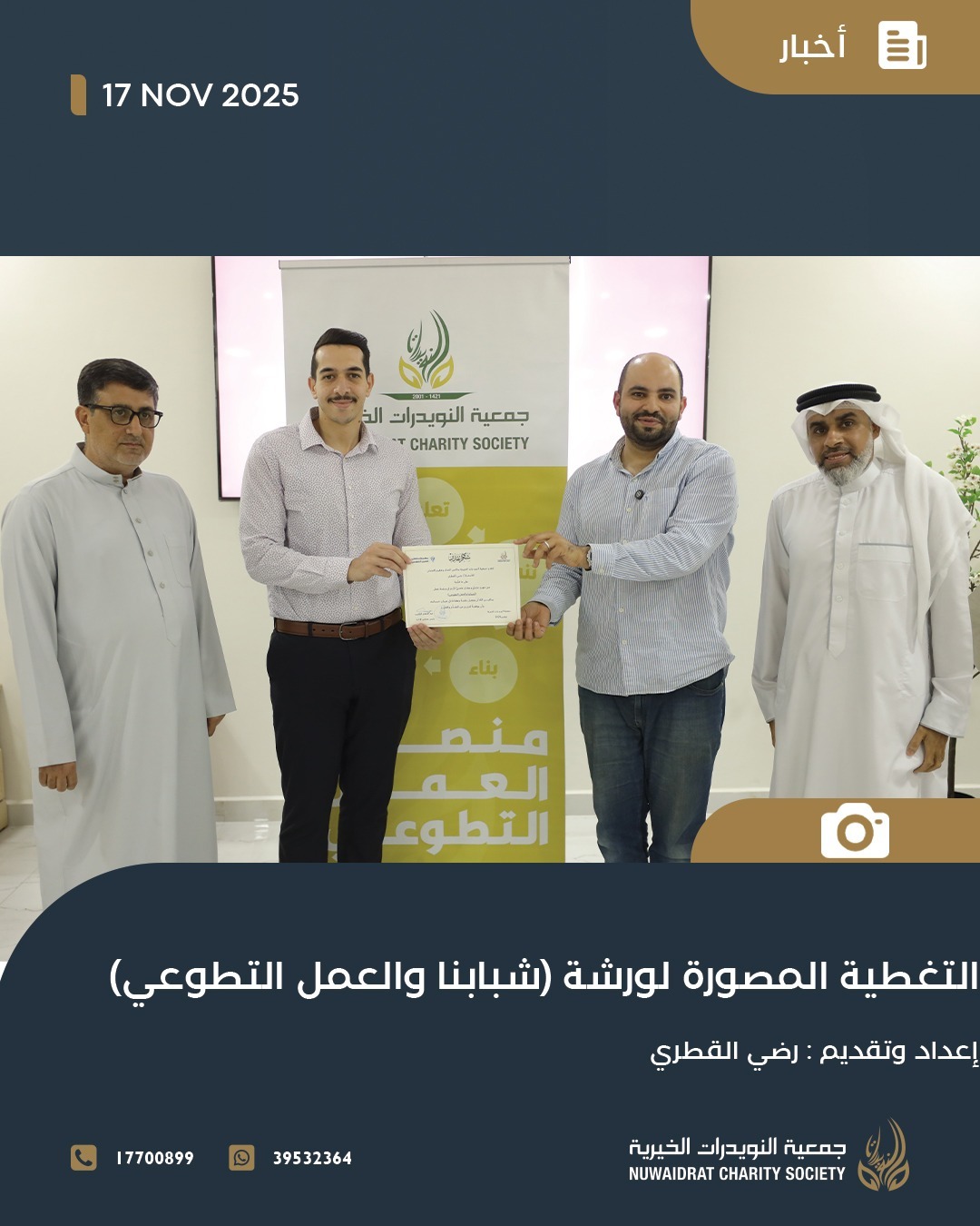 نظّمت جمعية النويدرات الخيرية مساء يوم الإثنين 17 نوفمبر 2025 ورشة بعنوان "شبابنا والعمل! أسئلة وأجوبة في خدمة الناس" قدّمها الأستاذ رضي القطري، وذلك في مقر الجمعية بالنويدرات.