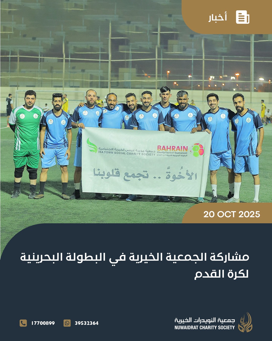 The Nuwaidrat Charity Association team participated in the ninth Bahrain Charity Football Championship, organized by the Isa Town Social Welfare Society at the Golden Eagle Fields in Salmabad, from October 17 to 24. The tournament featured 20 charitable and social associations from across Bahrain.